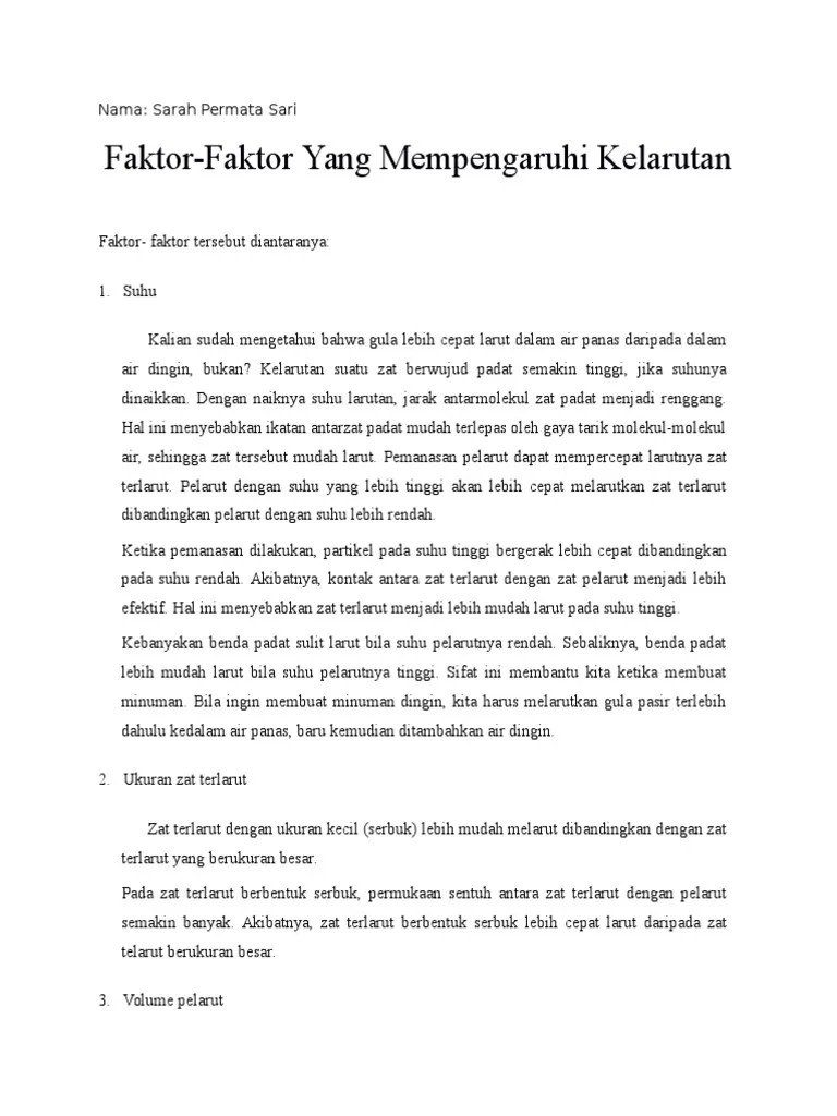 Gula dalam air, melarutkan garam dalam air, dan masih banyak contoh lain. Beberapa faktor yang mempengaruhi kelarutan antara lain:. Contoh larutan homogen yaitu air guladan alkohol dalam air. Cepat lambannya kelarutan gula pasir dalam air dapat dipengaruhi oleh beberapa faktor, yaitu: Dalam larutan garam tersebut, air adalah pelarut dan garam adalah zat.